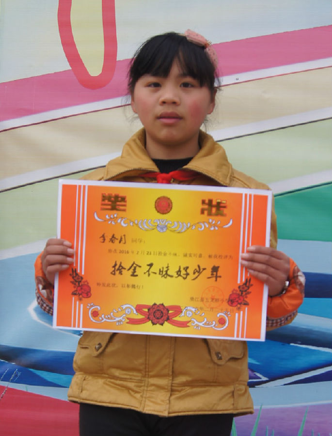 2016年3月4日上午,垫江县五龙桥小学积极开展向拾金不昧好少年李春月学习的活动。李春月,六年级二班的一位女学生。2016年2月23日开学报名之日,李春月同学拾到一大笔现金,在金钱面前她没有动私心,立即交给了学校老师,后来,学校找到了失主,失主表示万分感谢。李春月的行为充分体现了我校“好习惯成就好人生”的主题教育,展现了我校学生拾金不昧的高贵品质和良好的社会公德;是我校开展“规范良好行为,争做文明学生”主题班会,养成好习惯教育的典范。为此,学校特授予李春月同学为“拾金不昧好少年”的光荣称号。学校少先队大队部向全体学生提出号召,向李春月同学学习,让拾金不昧这这种精神在学校继续发扬光大,争做文明习惯好学生!