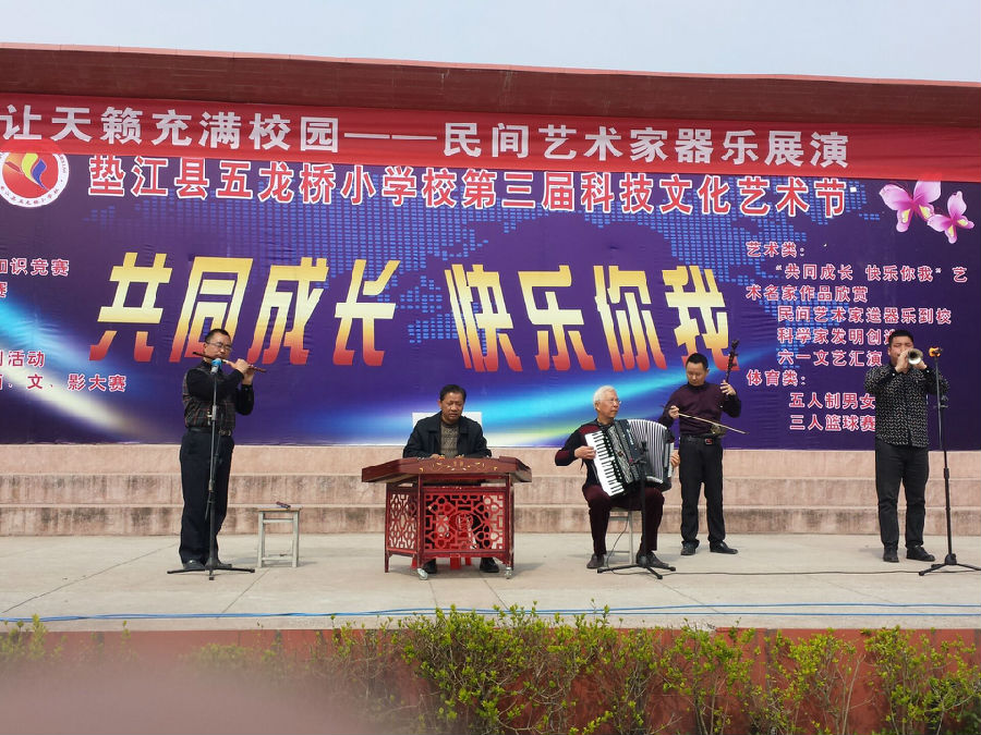 2016年3月14日上午,垫江县五龙桥小学组织全体师生,学生家长、部分社会群众等,观赏了由垫江县民间艺术团主办的“让天籁充满校园——民间艺术家器乐展演”的活动。活动中,艺术家们分别表演了唢呐独奏、二胡独奏、笛子独奏、葫芦丝独奏,以及扬琴、手风琴与这些乐器合奏等多种形式的表演。场上演员表演精彩纷呈、高潮迭起,场下观众掌声如雷,赞叹不绝。真是让观众们欣赏了一场别开生面的艺术大餐。