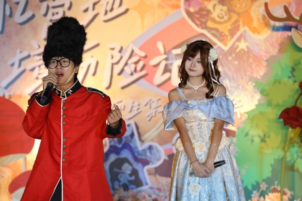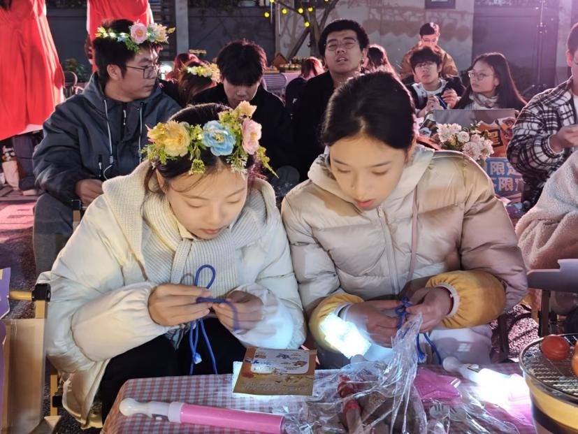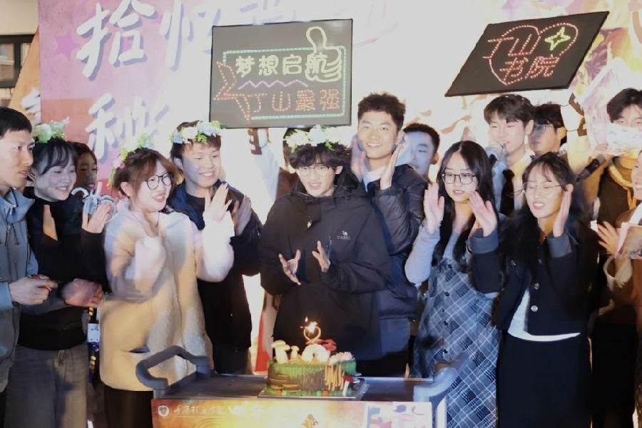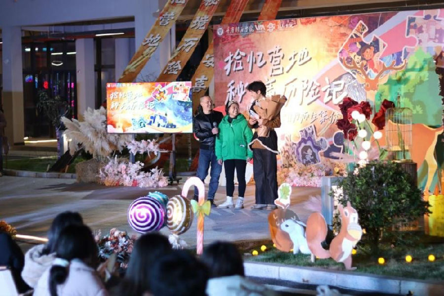 四枚魔法碎片拼合后,书院虚拟导师Lumi惊喜亮相,大屏流转着学子祝福与家人寄语。饰演克斯托夫的寿星易虹圳,意外迎来远道而来的父母,舞台上的深情拥抱,生动诠释了书院“家文化”的温度。庆典后,自由探索模式开启,纸牌搭建、观星望远、朋克机器人制作等摊位延续欢乐。此外,完成绳结挑战的寿星还能兑换丁山书院烙画工坊定制的专属礼品,为生日增添独特纪念。