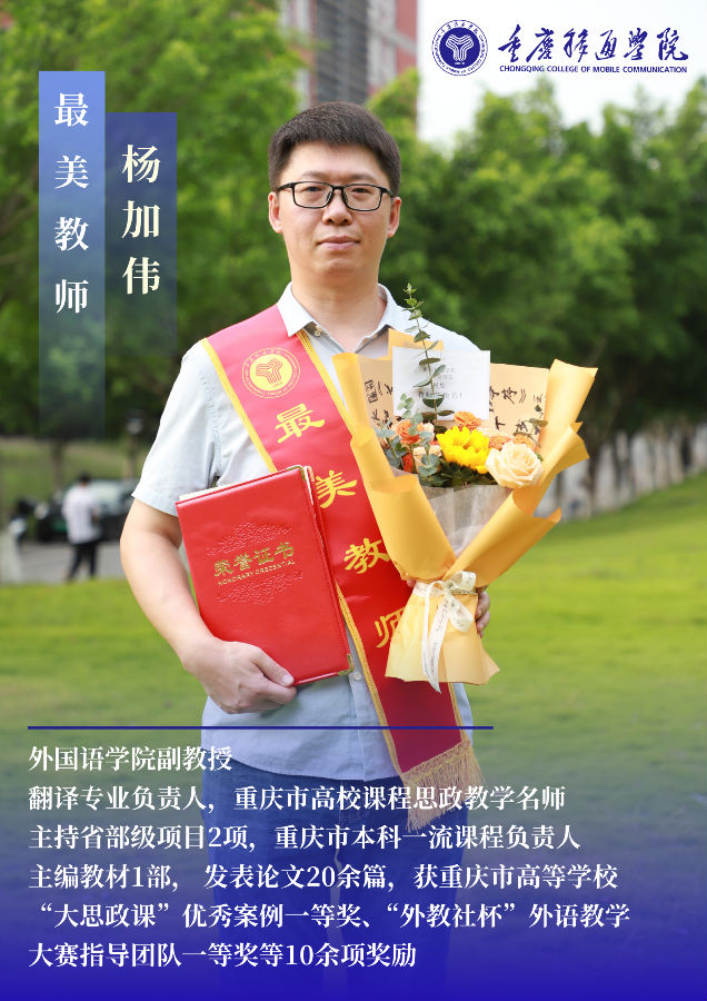 杨加伟,外国语学院教师,1982年12月生,中共党员,硕士,副教授,自2010年以来长期工作在外语教学第一线,主讲《高级英语》课程,主持建设的《高级英语(2)》课程获认定为“重庆市高校本科一流线下课程”、“重庆市高校课程思政示范课程”及校级“智慧课程”,获“重庆市高校课程思政教学名师”称号。主持市级科研项目2项,校级教改、科研项目3项,主研市级科研项目3项,校级教改课题若干项。获重庆市高等学校“大思政课”优秀案例评选活动一等奖、全国外语微课优秀作品征集与交流活动重庆赛区二等奖、外研社“教学之星”大赛课程思政案例专项赛二等奖、全国高校外语课程思政教学案例大赛二等奖、校级教育教学成果奖三等奖、校级课程思政教学竞赛三等奖等多项教学奖励。编写出版普通高等学校规划教材1部,发表论文10余篇,出版或发表译诗10余首。指导学生参加全国大学生英语翻译能力竞赛、“外文奖”全国大学生英语翻译大赛等各类学科竞赛获全国一等奖7项,二、三等奖若干。