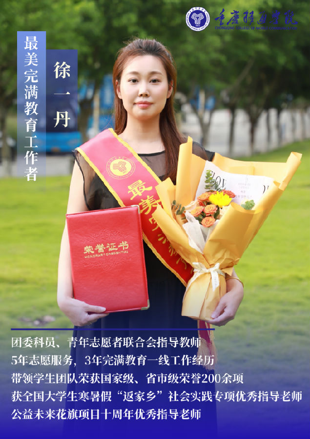在重庆移通学院,有这样一位完满教育工作者——她扎根志愿服务领域,以专业为笔、以奉献为墨,在学生成长与学校志愿服务品牌建设的画卷上,写下了浓墨重彩的篇章。她就是团委科员、青年志愿者联合会指导老师徐一丹,一位用行动诠释责任、用热爱浇灌教育的 “最美完满教育工作者”。
