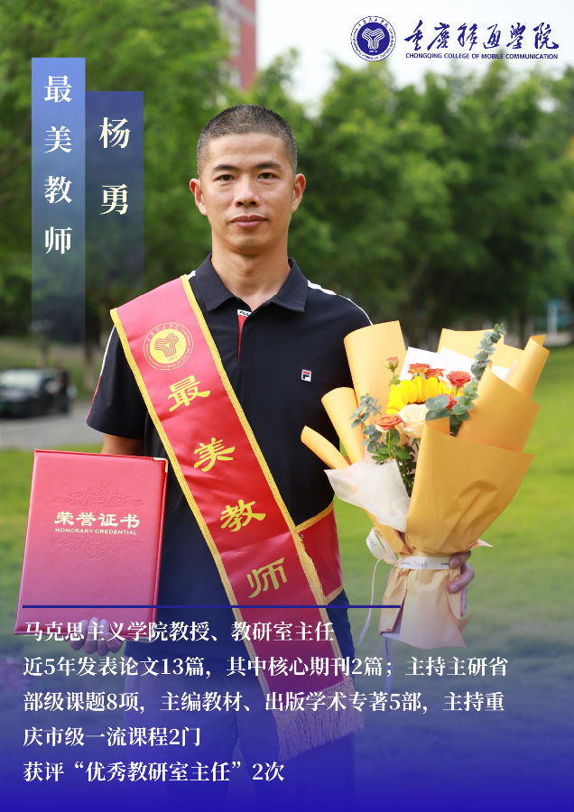 杨勇,马克思主义学院教师,1981年10月出生,中共党员,教授,2020-2021年度“优秀共产党员”、2020-2021年度、2022-2023年度“优秀教研室主任”。近5年发表论文13篇,其中全国中文核心期刊2篇;主持主研省部级课题8项、校级课题10余项,主编教材、出版学术专著5部;主持《思想道德修养与法律基础》校级教学团队;主持重庆市线上线下混合式一流课程、重庆市线上一流课程各一门。在历届校运会中获得教工男子400米、800米、1500米多项金牌并数次打破校运会纪录,获得校教职工乒乓球比赛一等奖、代表合川参加重庆市第六届运动会乒乓球项目获得团体第六名,获得校教职工羽毛球比赛二等奖。“文明其精神,野蛮其体魄”,以实际行动贯彻学校完满教育理念,在师生中起到了表率的作用。
