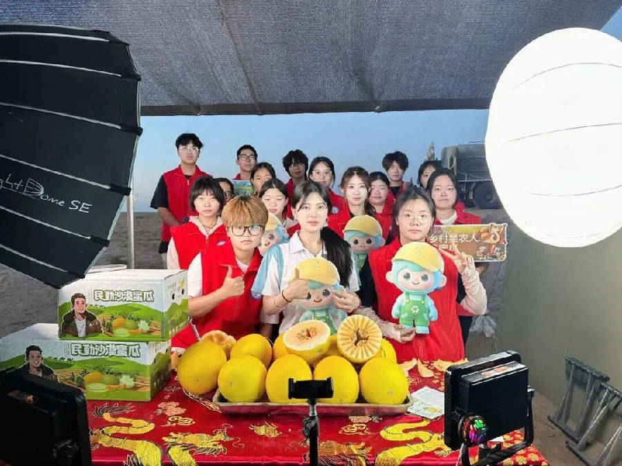 在民勤沙地,这群学子每天清晨六点便走进梭梭林,顶着超过40℃的高温和风沙,捡拾垃圾、标记枯树、清理流沙、引水灌溉。一周时间内,他们累计清理垃圾120余袋,为3000余棵梭梭树灌溉近1800m³水。他们不仅掌握了“冲坑慢渗”技术,参与基础设施建设、绘制林区示意图,更将“直播间”搬进沙海,运用商科思维和专业所学为民勤蜜瓜拓展销路。五场直播带动销售额超13万元,让当地的“滞销瓜”变成“增收果”。当地居民感动地说:“移通的学生真的太全能了,不仅能吃苦,更能帮我们想办法!”