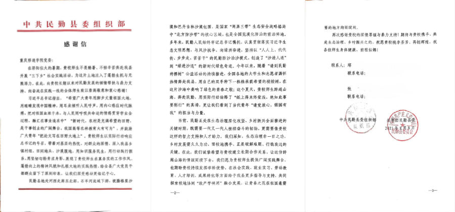 他们的真诚付出,赢得了中共民勤县委组织部的专函致谢,信中称赞师生们“为这片土地注入了蓬勃生机与无限活力”。