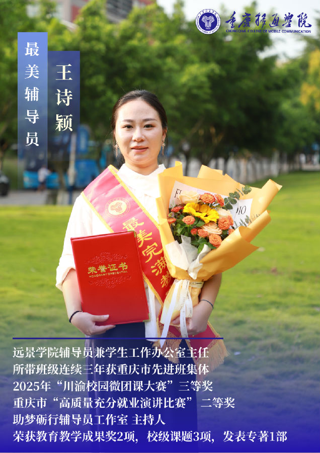 编者按:在重庆移通学院远景学院,有这样一位 “多面手” 完满教育工作者——王诗颖。自2018年入职以来,她以辅导员兼学工办主任的身份,既做学生思想引领的“引航员”,也当艺术美育的“播种人”,更成就业成长的“护航者”。6年间,她用创新的育人模式、温暖的陪伴坚守,在完满教育的赛道上,为一届又一届学生点亮了青春成长路。
