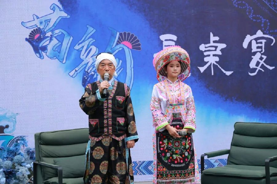 活动当天中午,百米长桌在古剑书院中庭蜿蜒铺开,蓝白相间的桌布上,苗族非遗美食团队精心准备的苗家酸汤鱼、腊肉糯米饭、五色糯米饭等地道佳肴一字排开,香气四溢。来自各院系的师生围坐在一起,在苗族婚俗传承人马开全老师的带领下,一边品尝美食,一边聆听苗家长桌宴的由来与苗族婚俗中的待客礼仪。